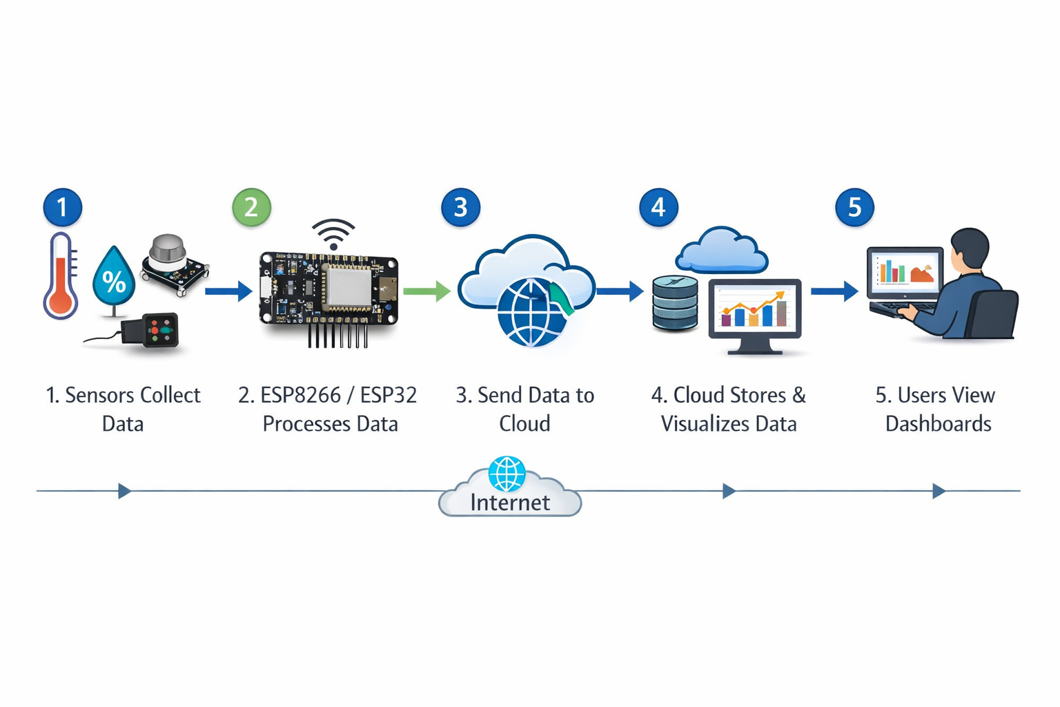 Microcontrollers such as ESP8266 and ESP32, equipped with built-in Wi-Fi connectivity, act as edge devices in IoT systems. These devices collect data from sensors, preprocess it, and transmit it to cloud platforms using standard communication protocols.